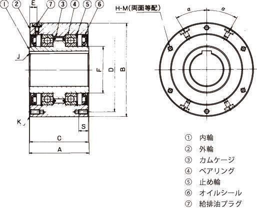 | 径 H7 | キー溝 | 面取り J | PCD D | 有効ネジ長さ S | サイズ H-M | |||||||||||||||