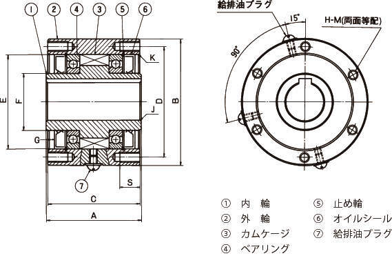 | 径 H7 | キー溝 | 面取り J | 径 E(M6) | 深さ G | 面取 K | PCD D | 有効ネジ長さ S | サイズ H-M | |||||||||||