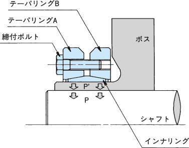 ・インナリング、テーパリングA、テーパリングBの3つの部品と締付ボルトで構成されたシンプルな構造です。