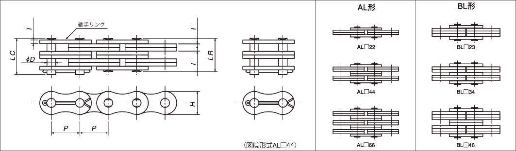 ・AL形のプレート外形、板厚寸法は、同一ピッチのRSローラチェーンの外プレートと同じです。ピン形状も同一ピッチのRSローラチェーンのピンと同じです。