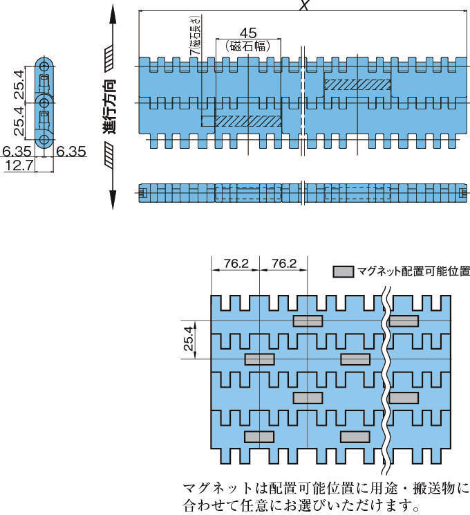 ・リンクに埋め込んだマグネットにより搬送物(磁性体)を吸着させて傾斜搬送を可能にします。