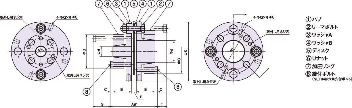 ・ディスク締結部は従来品と共通ですので、キー軸穴加工ハブ、クランプハブ、ロングスペーサ等他のシリーズと組合せを自由に選べます。