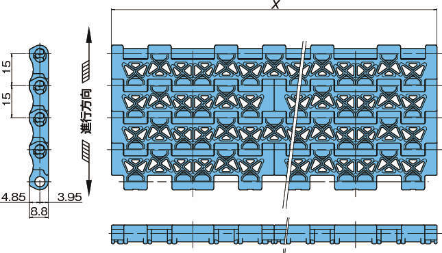 ・チェーン構造を備えたプラスチック製モジュールリンクをレンガ状に組合わせることにより、ベルト状のワイドな搬送面とチェーンとスプロケットの噛合わせによる確実な駆動を実現したプラスモジュラーチェーンです。