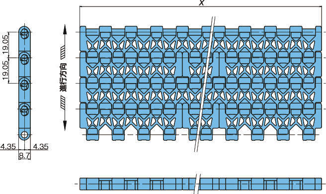 ・チェーン構造を備えたプラスチック製モジュールリンクをレンガ状に組合わせることにより、ベルト状のワイドな搬送面とチェーンとスプロケットの噛みわせによる確実な駆動を実現したプラスモジュラーチェーンです。
