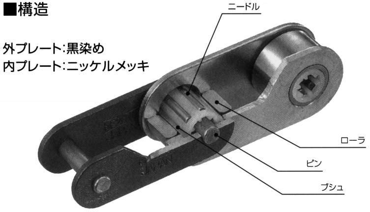 ・ピン~ブシュ間にニードルケージ(ケージはエンプラ製)を使用+スチール(外プレート:黒染め、内プレート:ニッケルメッキ)。