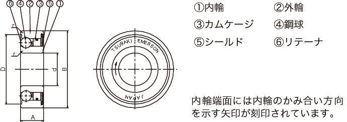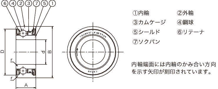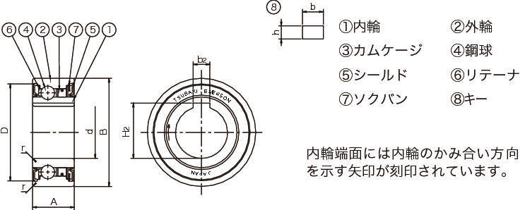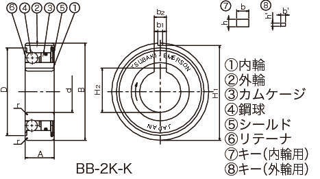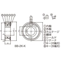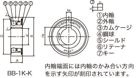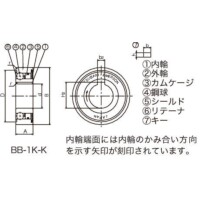 | タイプ | BB:標準 BB-1K-K:内輪キー溝付 BB-2K-K:内・外輪キー溝付 BB-2GD:両側ゴム接触シール付 BB-2GD1K-K:両側ゴム接触シール付、内輪キー溝付 |