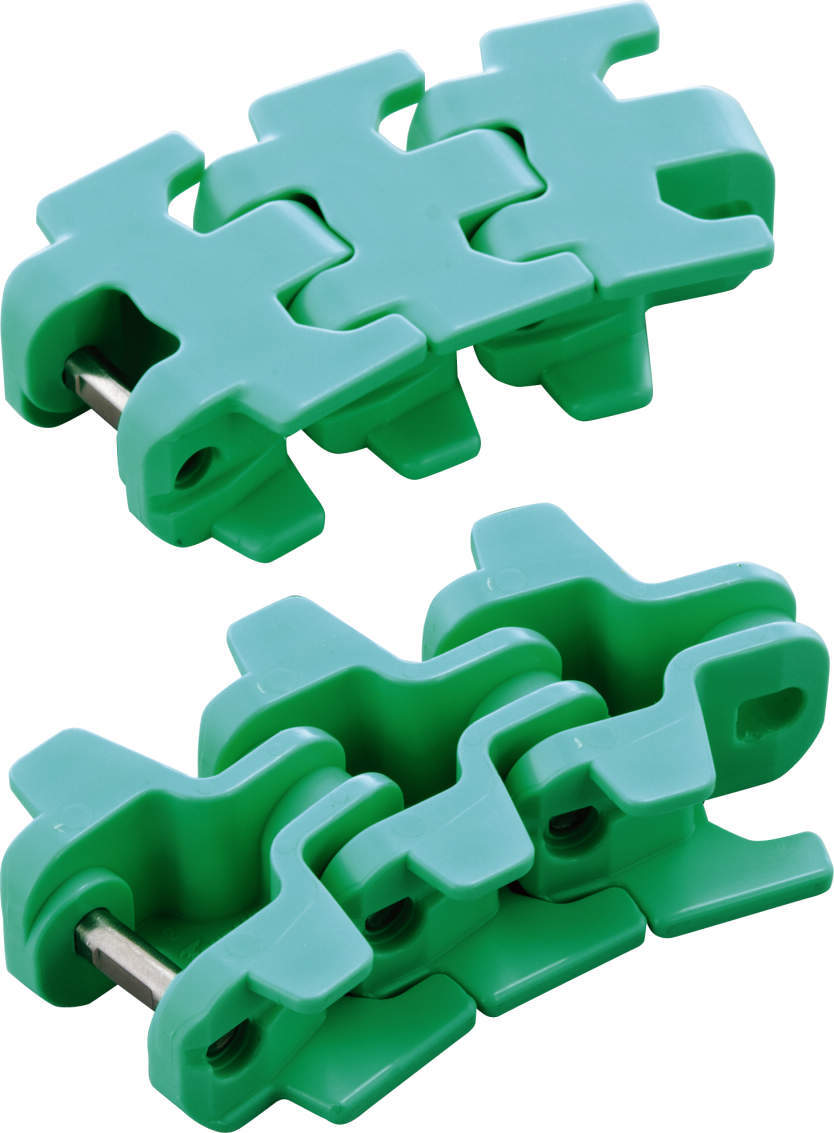 ・浮上がり防止アタッチメント付チェーン。コーナ部や上昇、下降コンベヤでの浮上がりやリターン側でのプレート上面のきずつきを防止します。