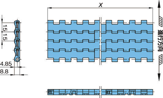 ・チェーン構造を備えたプラスチック製モジュールリンクをレンガ状に組合わせることにより、ベルト状のワイドな搬送面とチェーンとスプロケットの噛みわせによる確実な駆動を実現したプラモジュラーチェーンです。