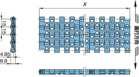 ・チェーン構造を備えたプラスチック製モージュールリンクをレンガ状に組合わせることにより、ベルト状のワイドな搬送面とチェーンとスプロケットの噛合わせによる確実な駆動を実現したプラスモジュラーです。