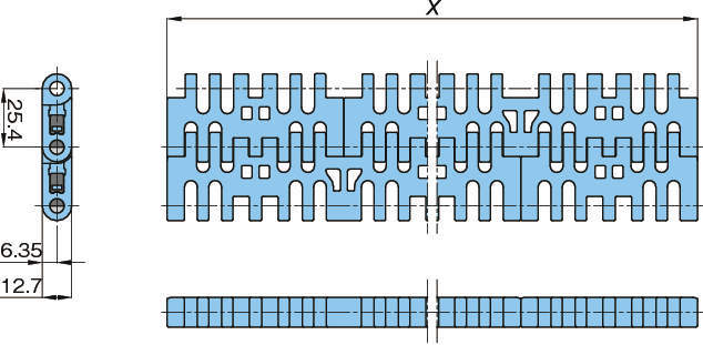 ・チェーン構造を備えたプラスチック製モージュールリンクをレンガ状に組合わせることにより、ベルト状のワイドな搬送面とチェーンとスプロケットの噛みわせによる確実な駆動を実現したプラスモジュラーです。