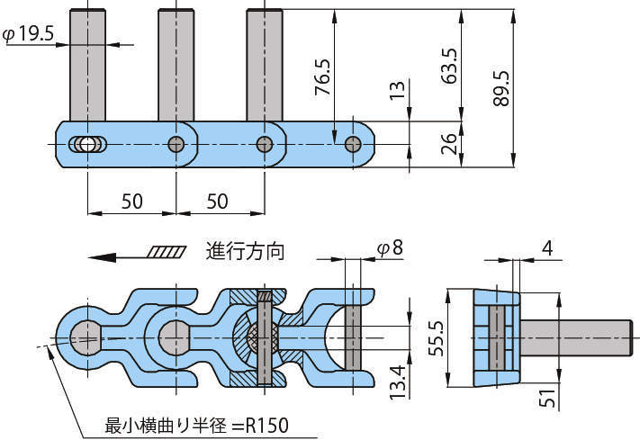 ・小さな横曲がり半径(R=150)。自由なライアウトが可能で、狭いスペースでの搬送に最適です。