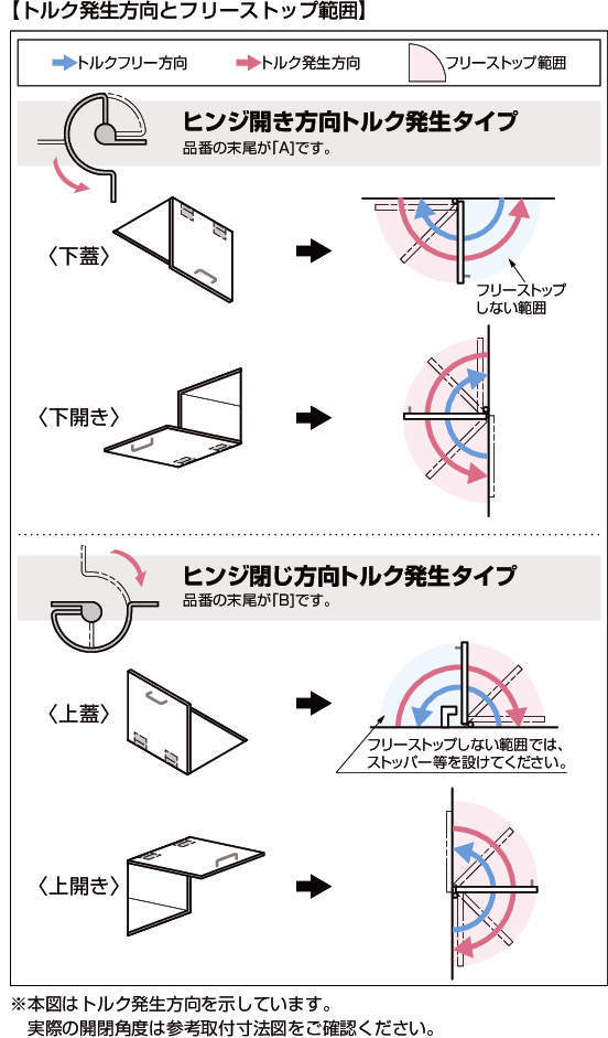 ・一方向のみにトルクが発生するトルク裏蝶番です。逆方向トルクが発生しないため、扉などをスムーズに操作できます。