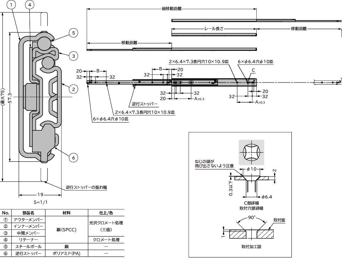 ・中間メンバー残留防止機構付のため、レールを全閉しても中間メンバーは、はみ出ません。