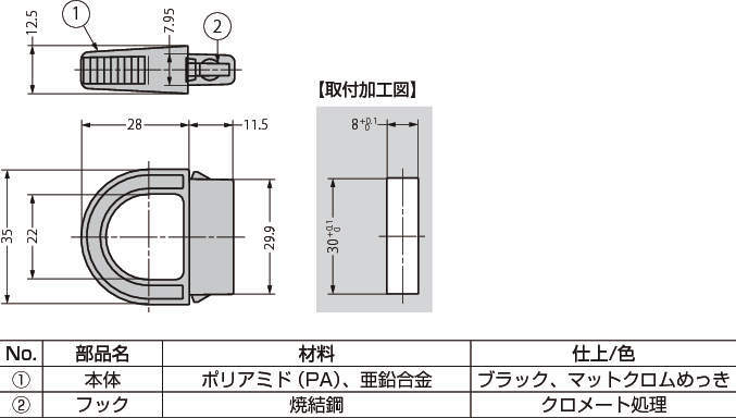 | 材料・仕上 | 413-9001:亜鉛合金(ZDC)、マットクロムめっき 413-9008:亜鉛合金、ブラック |