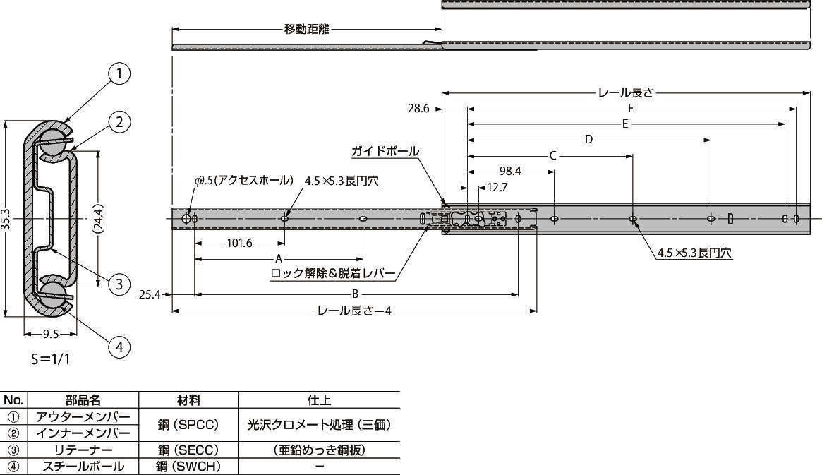 ・レール全開状態で固定します。レバー操作で解除でき、同じレバーでインバーメンバーを取り外せます。