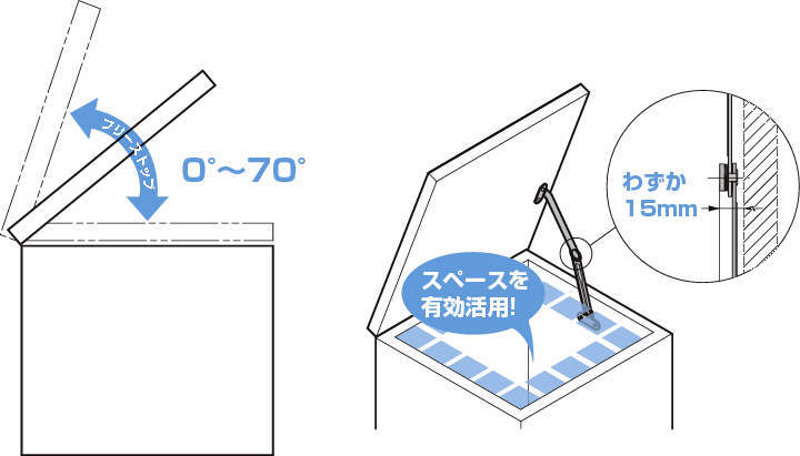 ・任意の位置で扉を保持できるフリーストップ機構付きです。筐体や開口部の使い勝手を大幅に向上させます。