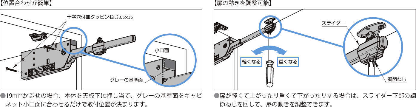 ・19mmかぶせの場合、本体を天板下に押し当て基準面をキャビネット小口面に合わせるだけで取付位置が決まり、位置合わせが簡単です。