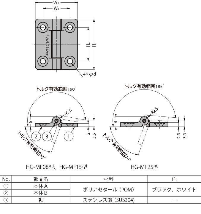 | HG-MF25-BL | ブラック | 28 | 18 | 40 | 25 | 2.5 | φ3.2穴φ6.2皿 | 24.5±33% | 2.5±33% |