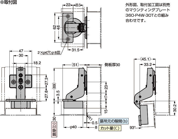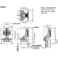 ※写真はスライドヒンジ本体(ダンパー内蔵)と別売のマウンティングプレートの組み合わせです。