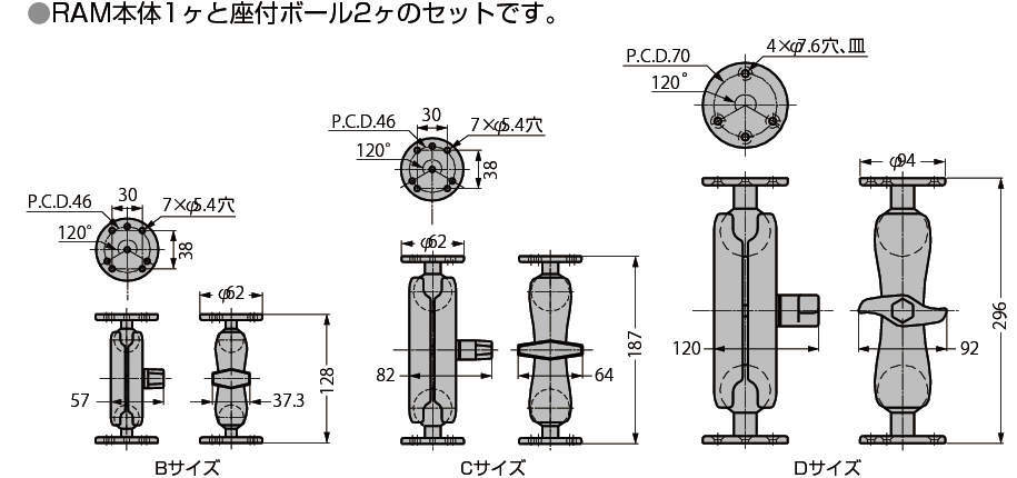 ・ボールはφ25.4mm(Bサイズ)、φ38mm(Cサイズ)、φ57.4mm(Dサイズ)の3種類があり、それぞれのサイズに合ったRAM本体があります。