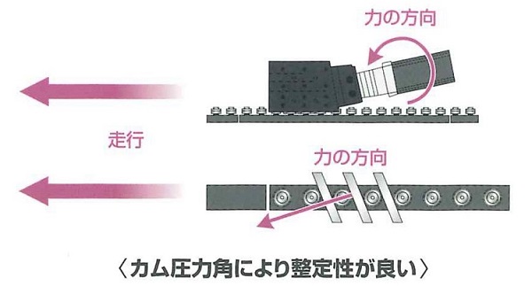 カムとベアリングの転がり伝達で摩耗が少なく初期精度を長期間維持できます。