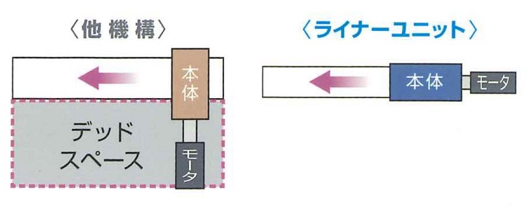 駆動源をレールと一直線上に配置するので、他機構に比べてデッドスペースを削減できます。