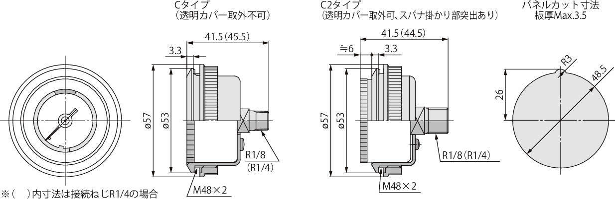 | G46-2-02-L-C | G46-L | 空気 | 背面ねじ | R1/4 | 0.2MPa | 0~0.2MPa | 0.01~0.1MPa | ±3F.S.(フルスパン) | 0.05 | ポリカーボネート | 透明カバー付(突出なし・取外不可) | - |