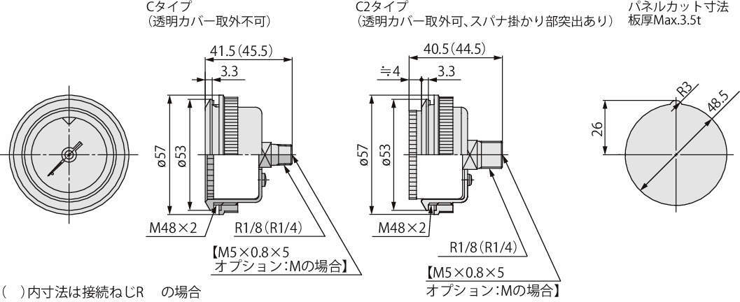 | G46E-2-01M-C | G46E | 空気 | 背面ねじ | R1/8(めねじ M5×0.8) | 0.2MPa | 0~0.2MPa | ±3F.S.(フルスパン) | 0.08 | 透明カバー付(突出なし・取外不可) | - |