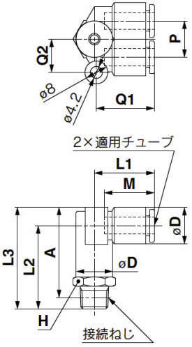KGV04-M5-X12 ユニバーサルエルボユニオン KGV ミリ φ4mm ガスケットシール M M5×0.8 SUS303 8 10.4 9.8 20.5 11 18.5 15 16 2.9 2.9 6 潤滑剤:白色ワセリン