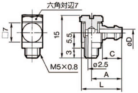 MS-5ALHU-6-X83 バーブエルボ MS-ALHU (軟質チューブ用) φ6mm×φ4mm M5×0.8 10.8 7 2.5 14.6 2.4 3.7 ガスケット材質:SUS304・NBR
