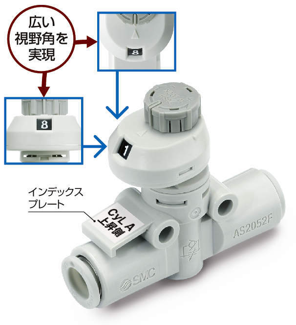 ・面当てストッパ(回転ストッパ)の採用により全閉 時(流量0)のハンドル 位置が常に一定。