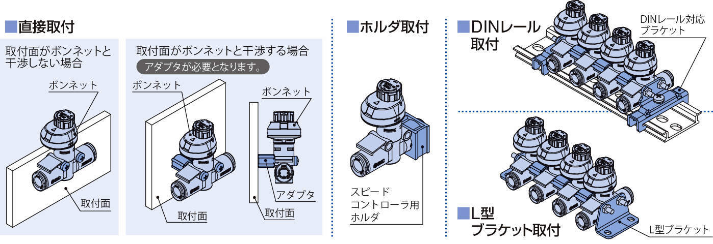 ・直接取付、ホルダ取付、DINレール取付、L型ブラケット取付。