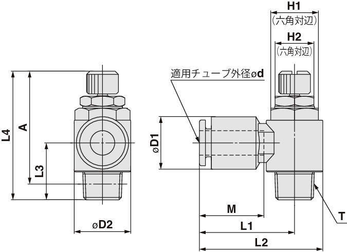 | タイプ | 外径 φd | シール方式 | ねじタイプ | 接続口径 T | 自由流れ | 制御流れ | 自由流れ | 制御流れ | 自由流れ | 制御流れ | (mm) | (mm) | MAX. | MIN. | MAX. | MIN. | |||||||||||||||