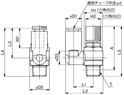 | タイプ | 外径 φd | シール方式 | ねじタイプ | 接続口径 T | 自由流れ | 制御流れ | 自由流れ | 制御流れ | 自由流れ | 制御流れ | MAX. | MIN. | MAX. | MIN. | ||||||||||||||||||||||