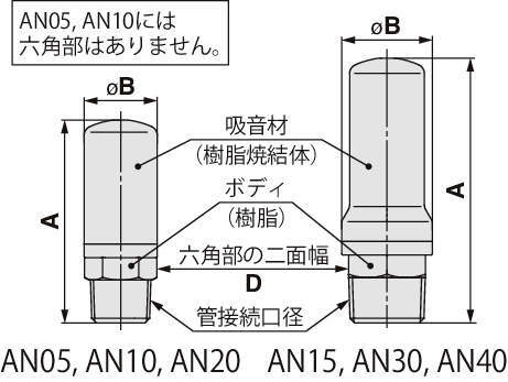 | AN05-M5 | AN05 | 05 | 30dB(A) | M | M5×0.8 | 1.0MPa | 5 | 1 | 0.4以下 | 15 | 6.5 | - | 0.5 |