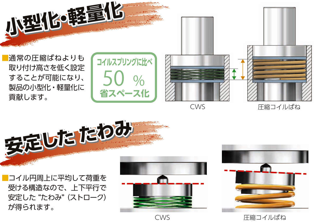 ・通常の圧縮ばねよりも荷重を強力にすることができ、取り付け高さの省スペース化が可能です。製品の小型化に貢献します