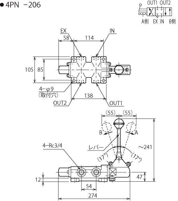 | 4PN-103 | ハンドバルブ | 3位置クローズドセンタ形 | 3/8 | 31 | 2.3 |