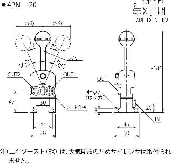 | 4PN-20 | ハンドバルブ | 3位置クローズドセンタ形 | 1/4 | 7.3 | 0.9 |