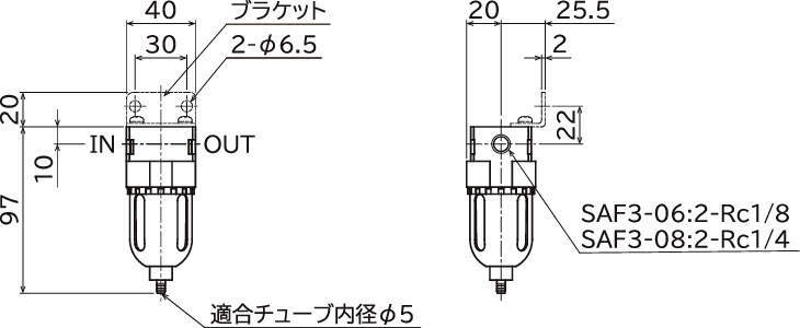| SAF3-06 | エアフィルタ | SAF3 | 06 | Rc1/8 | 1MPa | 5μm | 9.5cm3 | 手動ドレン付 | なし | なし | 0.19kg |