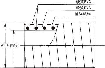 ・外面が硬質塩ビで保護されているため、外面摩耗に強く、補強糸の出にくい構造です。