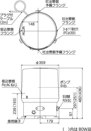 | WP-105T-1 | 単相100V | 50 | 100 | 260 | 8 | 6 | 16 | 70 | 140 | 20 | 3/4B | 20 | 3/4B | 15.0 |