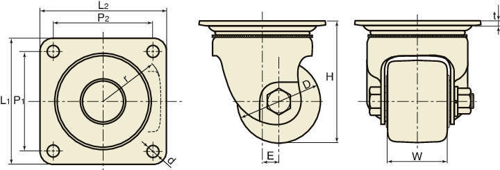 ・車輪径を小さく、取付高さも低く、しかも重荷重に耐える設計で、機能性、耐久性が優れています。