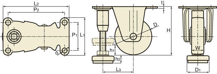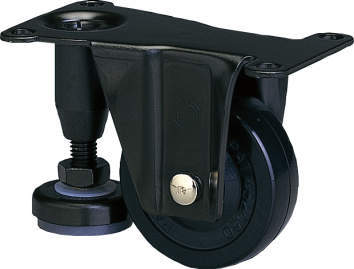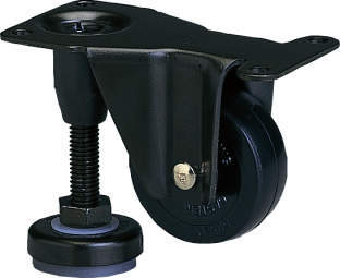 ・車輪とフットが同一部に組み込んであり、同時旋回しますので設置面の状況によりフットの位置が自由に変えられ、また旋回半径がキャスター単体とほとんど変わりません。