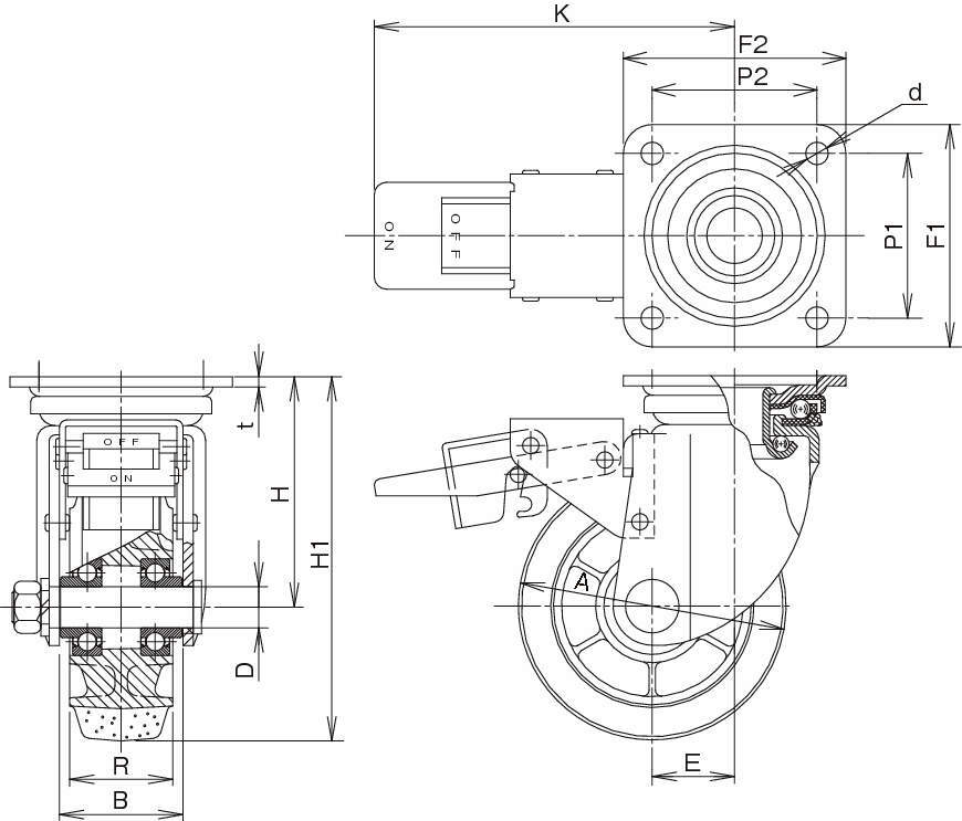 ・JMB型重荷重用ストッパー付旋回金具付きのキャスターです。
