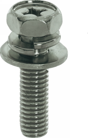 ・六角アプセットボルトにばね座金と平座金が組込まれており脱落しません。組込み式なので作業効率が向上します。締付け工具はボックスレンチ、メガネレンチ、十字ドライバーが適切です。耐食性向上のため、三価クロメートメッキ(薄青っぽい色合い)がしてあります。