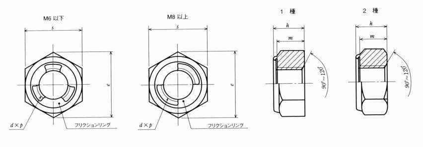 ・金属製のフリクションリング部にプリベリングトルクが発生し、それによる摩擦抵抗によってゆるみ止め効果が生まれます。着脱が何回も可能で、ナットの高さは規格品より少し高くなっています。耐食性向上のため、三価クロメートめっき(薄青っぽい色)がしてあります。