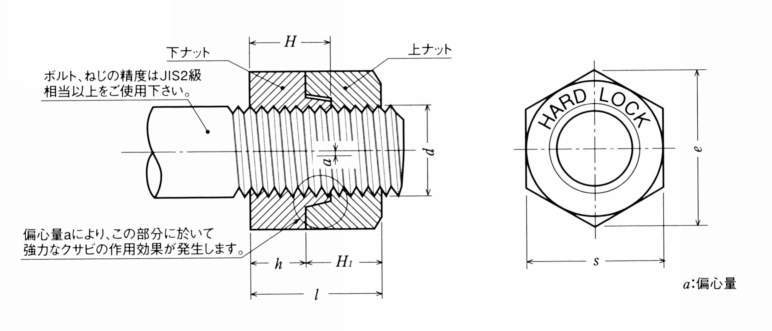 ・雄雌のナットで構成され、雄ナットを締付けナットとして、雌ナットをロックナットとして使用します。雄ナット凸部が偏芯していて締付けるとクサビ効果が発生します。着脱を繰り返してもゆるみ止め機能を維持します。ステンレスなので耐食性、耐熱性に優れています。