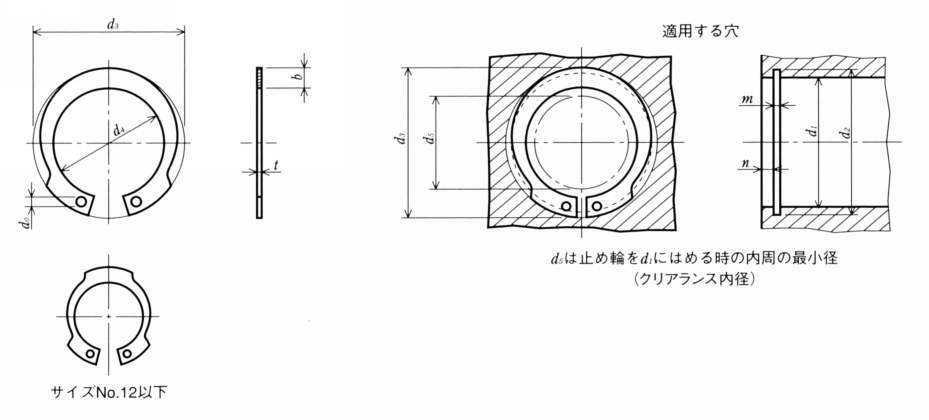 ・穴内の位置決めに使用します。穴の内径と止め輪の内径が同芯になるので取り付け後、穴部軸を通す場合に使用します。生地で錆びやすい為、常に油のかかる環境下か耐食性を必要としない場所に使用します。