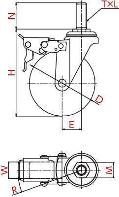・車輪の回転と旋回部の回転を同時にロックするストッパーです。