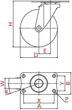 ・取付座がプレート状となっており、ねじやボルトで取付けるタイプのキャスター。